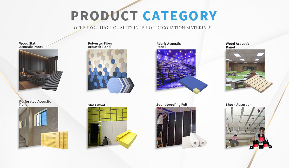 Ana ürünler:Ahşap akustik Panel, kumaş akustik levha, Polyester elyaf Panel, kütle yüklü vinil, titreşim izolatörü